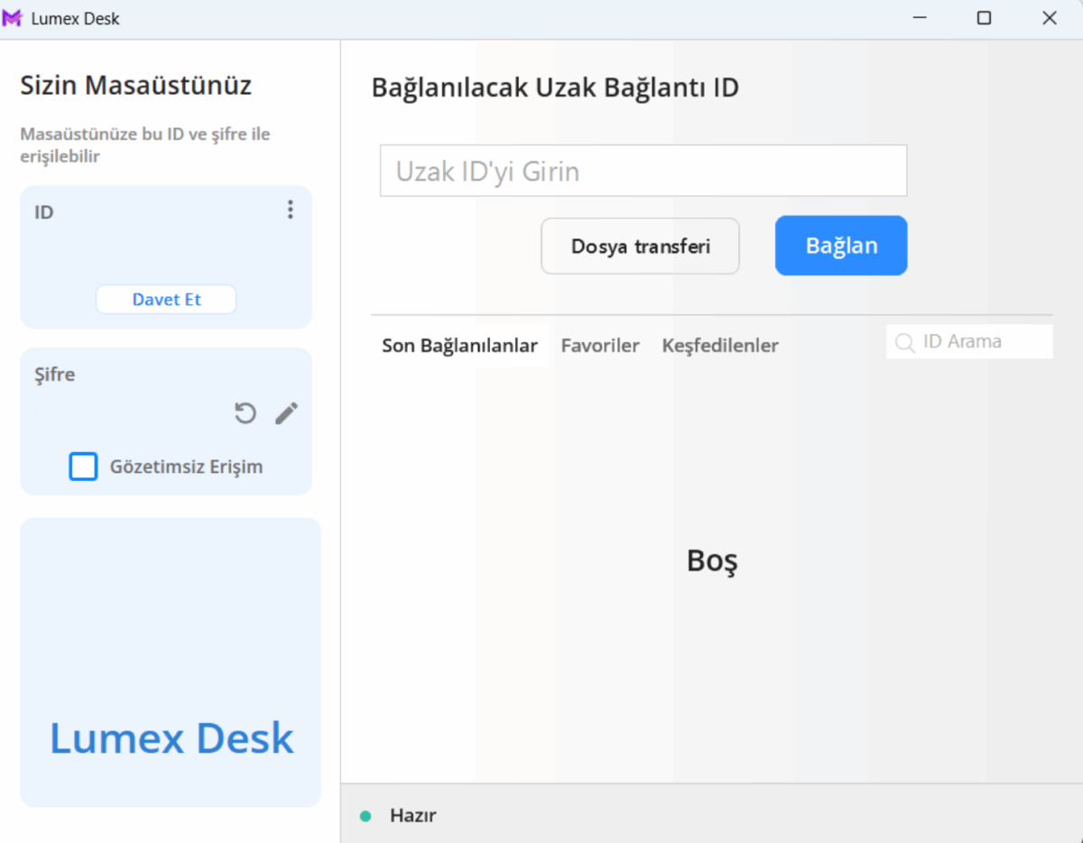 LumexDesk, bilgisayarınıza her yerden güvenli ve hızlı bir şekilde erişmenizi sağlayan gelişmiş bir uzak masaüstü çözümüdür. Modern iş dünyasının gereksinimlerini göz önünde bulundurarak tasarlanan LumexDesk, hem Mac OS hem de Windows kullanıcıları için çapraz platform desteği sunar. Karmaşık ayarlara ihtiyaç duymadan, sade ve kullanıcı dostu arayüzü sayesinde dakikalar içinde bağlantı kurabilir, işlerinizi kesintisiz bir şekilde yönetmeye başlayabilirsiniz.